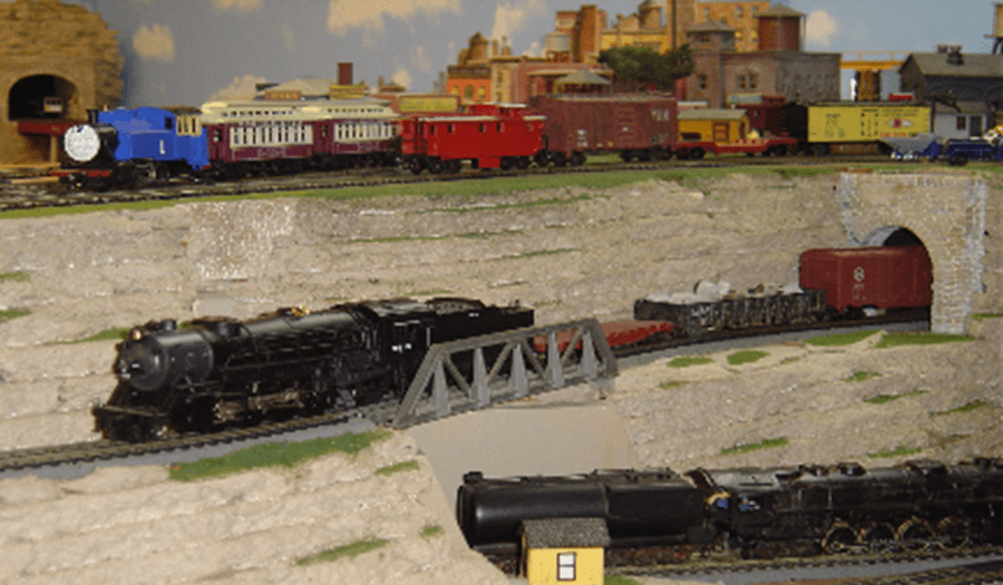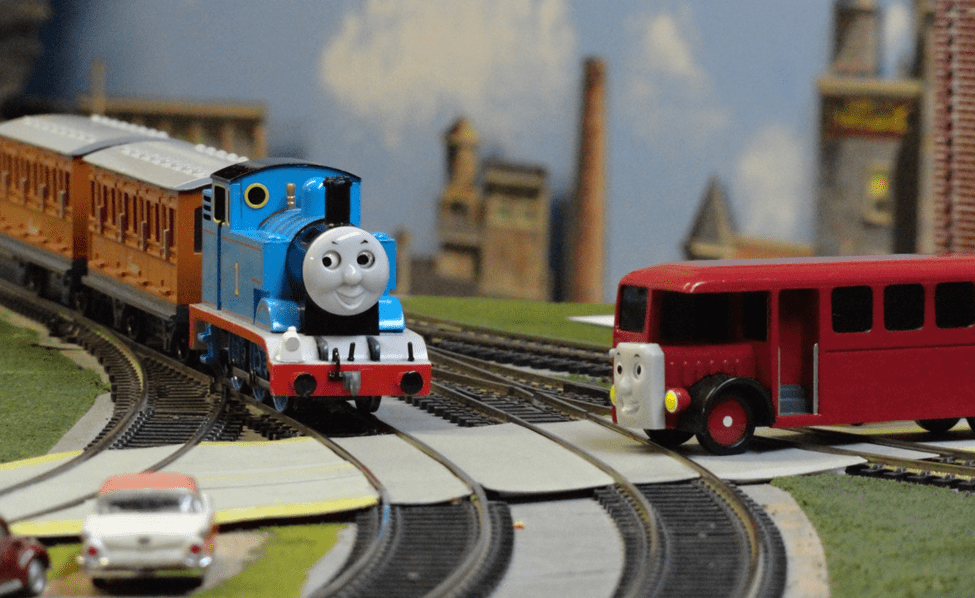 As the boys grew older and liked computers and video better than wooden trains they got interested in making their own videos on grandpa’s train layout in addition to their own wooden track layout. They had acquired some Thomas HO trains by Bachmann with faces and moving eyes and tried making a few of their own videos with a home digital camera, lights and a tripod. I recall them setting up collision scenes and writing script for their home-made movie. One featured Bertie the Bus. We tied a thin fishing line to Bertie and dragged him slowly through the scene with Thomas at the station: