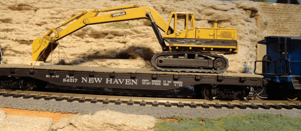 I was disappointed that the 1/87th size Caterpillar back hoe’s apparently jointed booms had false hinges, but while it is not good for action – it could work as a shipping load. I made a rest for the shovel from wood sticks and used brown thread looped around the load and the simulated wood deck then tied on the bottom side out of sight. I was glad that my photos show the tie-down cables for this special load. It would fit on a flat car and the overall height of 17 scale feet just barely falls within height limit tolerance.
