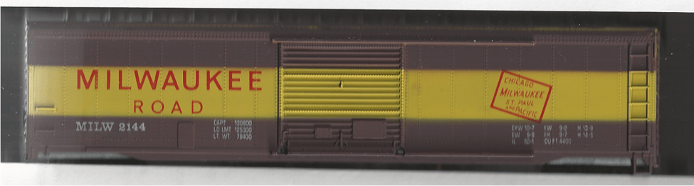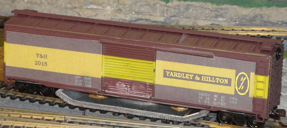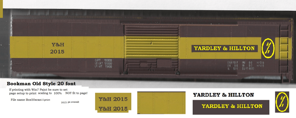 I wanted to try my art work on a 50 ft. boxcar. I laid this simple smooth sided car (doors are fixed and don’t open) on the scanner to get its colors into the paint program for alteration. Then I changed the lettering with the computer program to create my art. Home computers cannot print white so I kept the dimensional data from the original. Let’s look at my efforts before, during, and after: